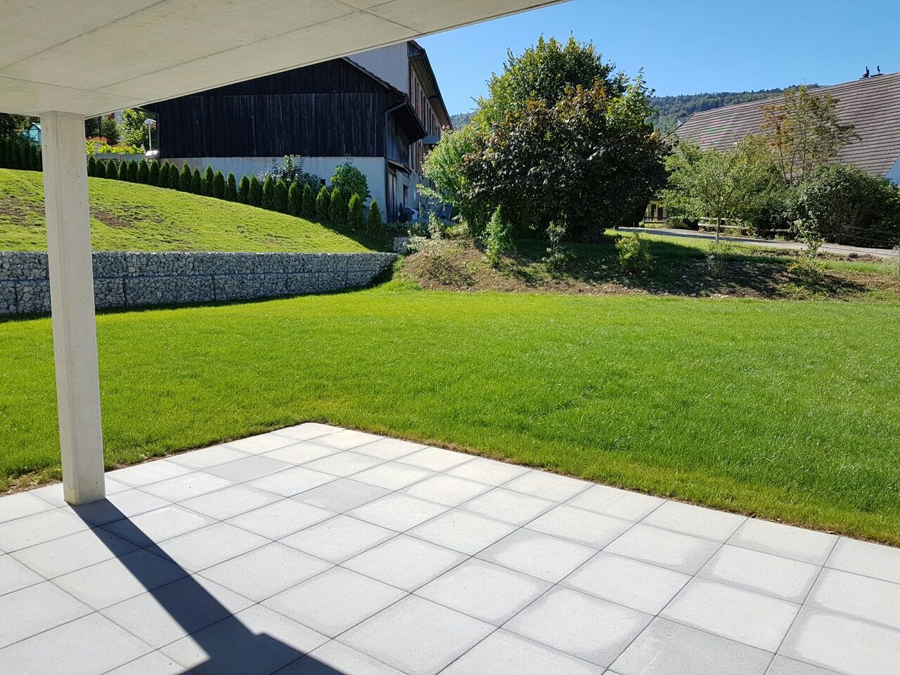 L'extérieur est tout autant soigné. Terrasse dallée et couverte. Les arbustes ont été sélectionnés minutieusement ainsi que le mur de pierre en soutien. CHF 40'000.- ont été dédiés à l'aménagement extérieur.