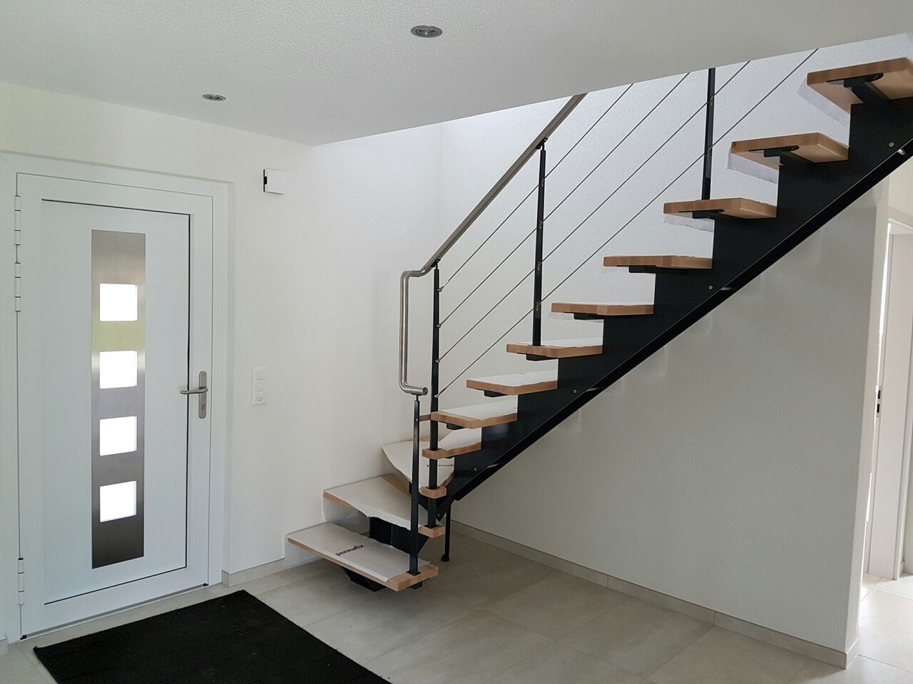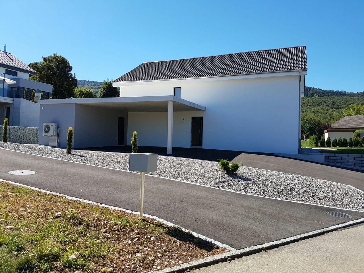 Elle a été équipée avec goût et modernité. Le chemin d'accès est pratique et mènera à deux places de parc couvertes. Un local extérieur est à disposition depuis sous le couvert. Il peut servir de local à vélo ou d'atelier.